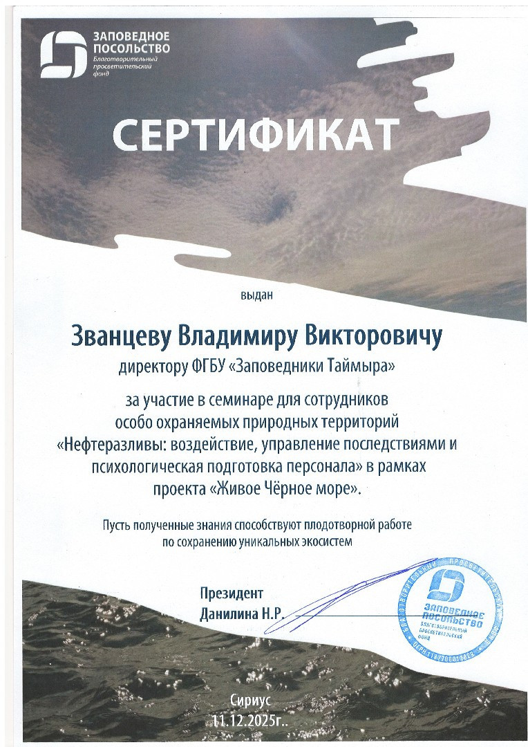 Директор ФГБУ «Заповедники Таймыра» Владимир Званцев принял участие в комплексном семинаре «Нефтеразливы: воздействие, управление последствиями и психологическая подготовка персонала». Мероприятие было организовано благотворительно-просветительским фондом «Заповедное Посольство» и прошло с 8 по 11 декабря 2025 года в Сочи и на федеральной территории «Сириус».